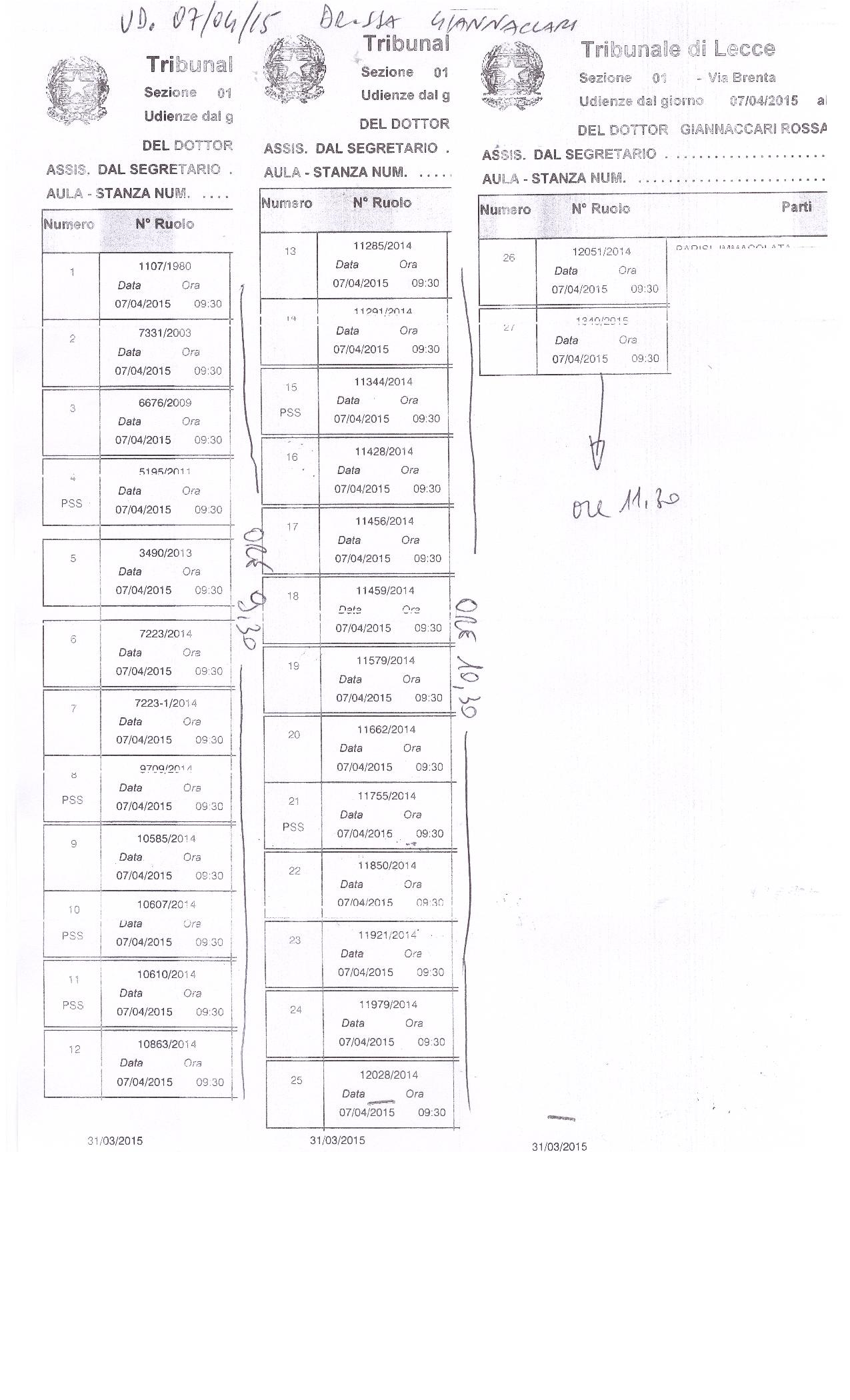 TRIBUNALE DI LECCE Ia SEZ. CIVILE - Ruolo udienza dr.ssa Giannaccari del 7 aprile 2015