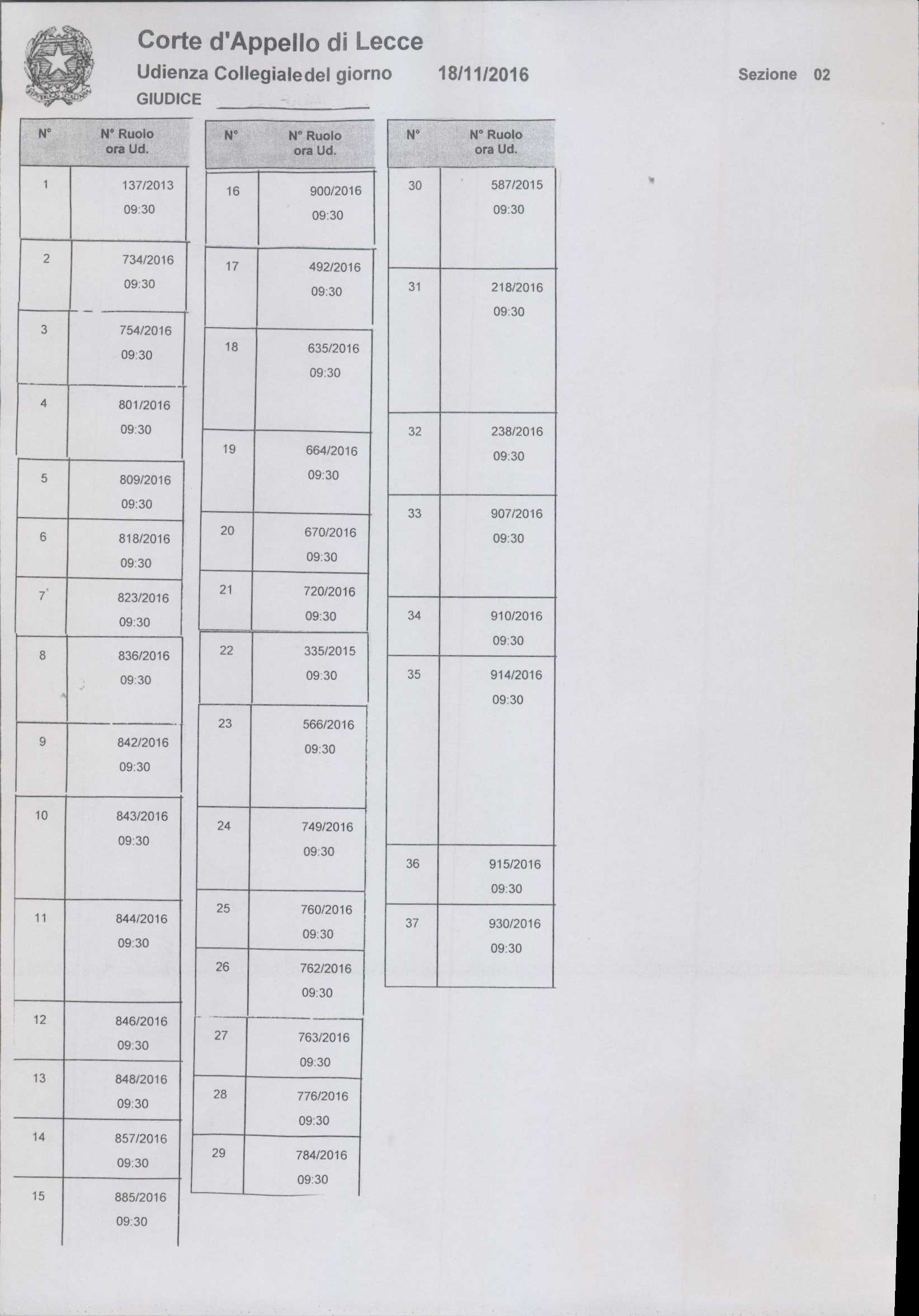 Corte di Appello di Lecce 2a Sezione - Udienza del 18 novembre 2016