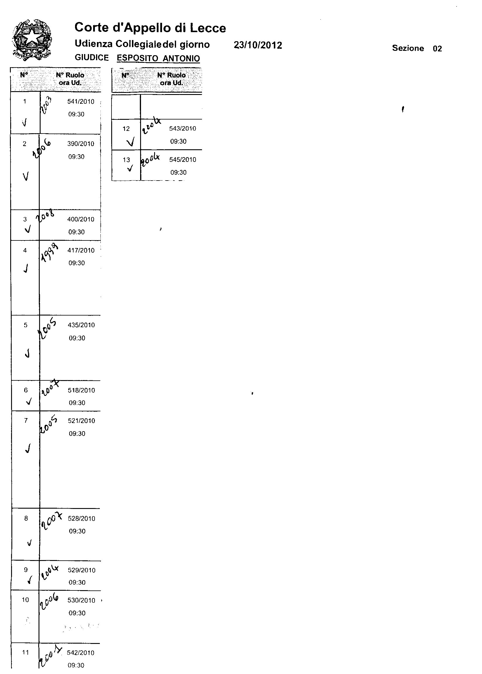 CORTE DI APPELLO DI LECCE II^ SEZIONE CIVILE ruolo di udienza della 2^ sezione del 23-10-2012. Si segnala che l'udienza comincerà alle ore 9,30 e si procederà seguendo l'ordine del ruolo senza una suddivisione di orario