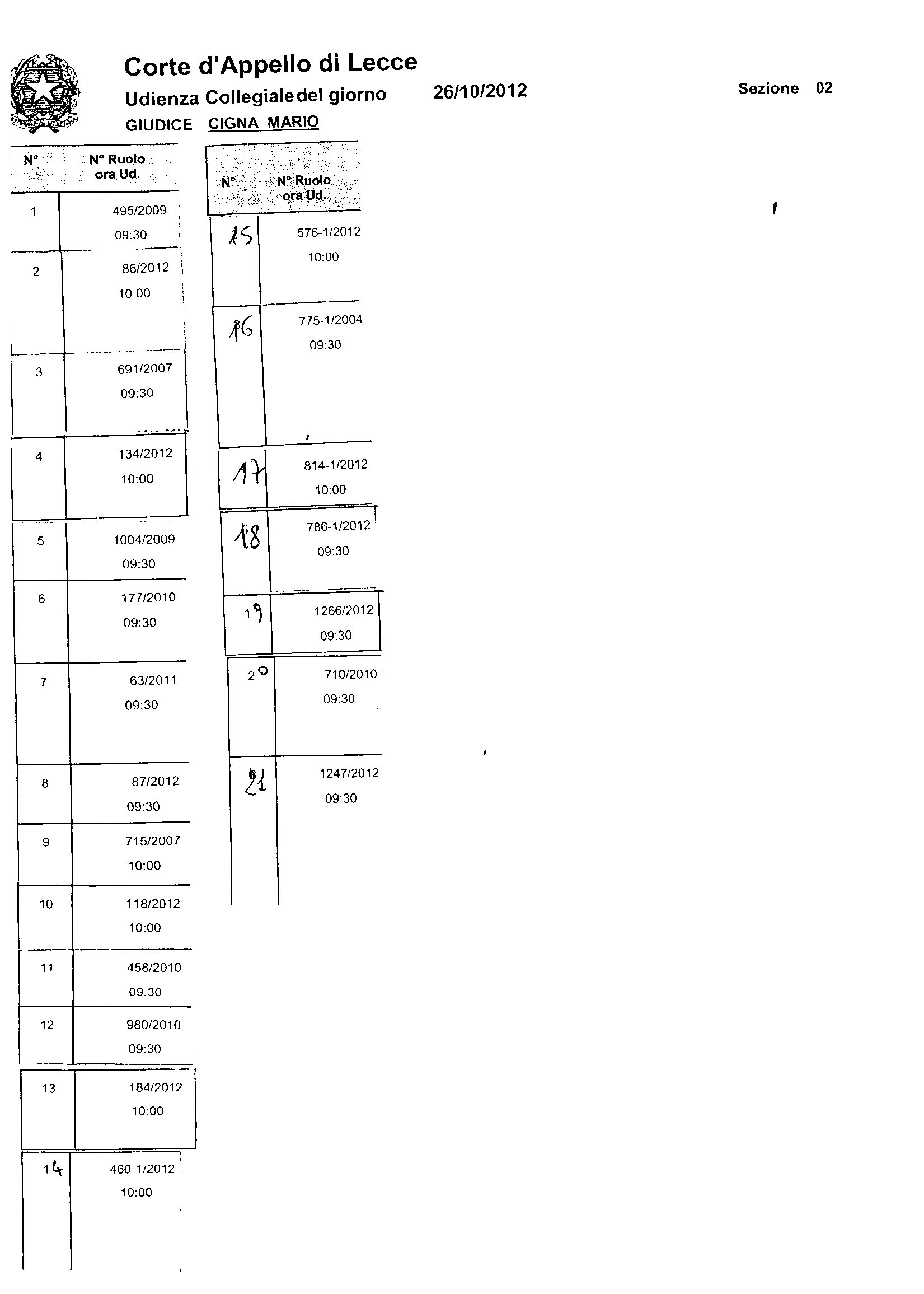 Ruolo di udienza della seconda sezione civile Corte di Appello di Lecce del 26-10-2012