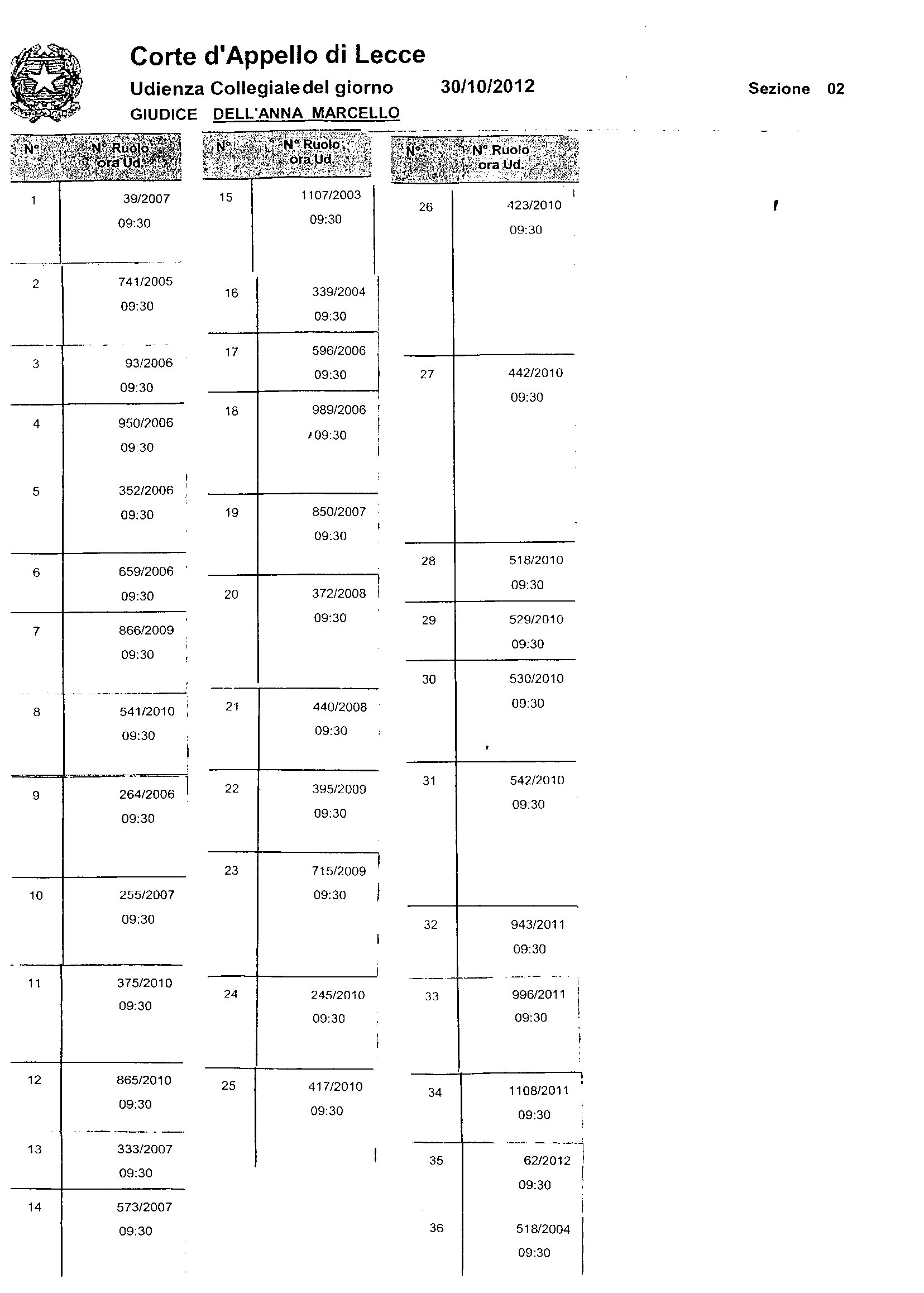 ruolo di udienza della seconda sezione civile Corte di Appello di Lecce del 30-10-2012.