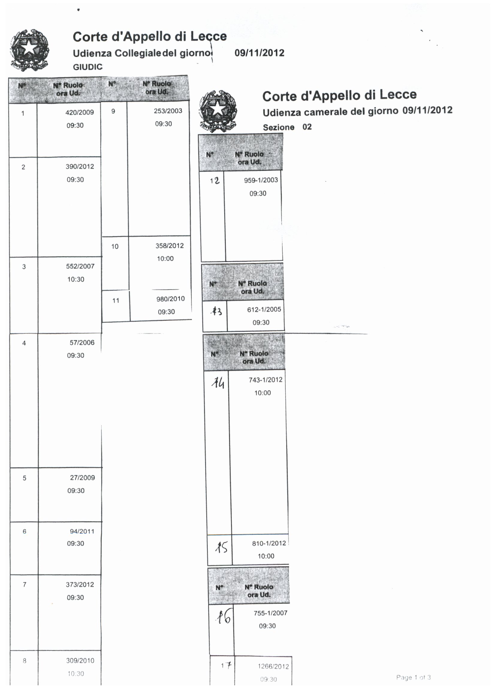 ruolo di udienza della seconda sezione civile Corte di Appello di Lecce del 9-11-2012.