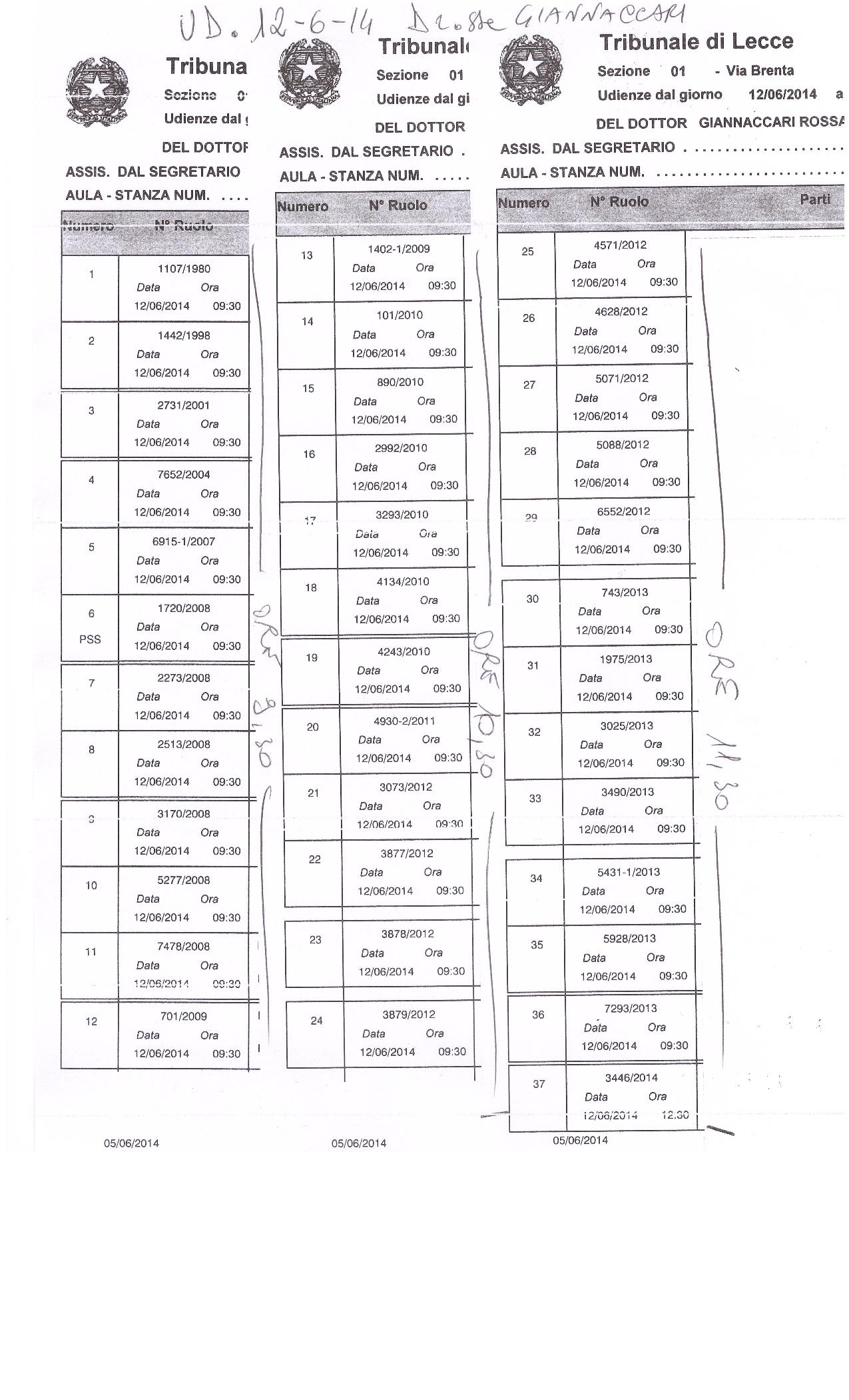 TRIBUNALE CIVILE DI LECCE Ia SEZIONE - Ruolo udienza del 12 giugno 2014 della dr.ssa Giannaccari