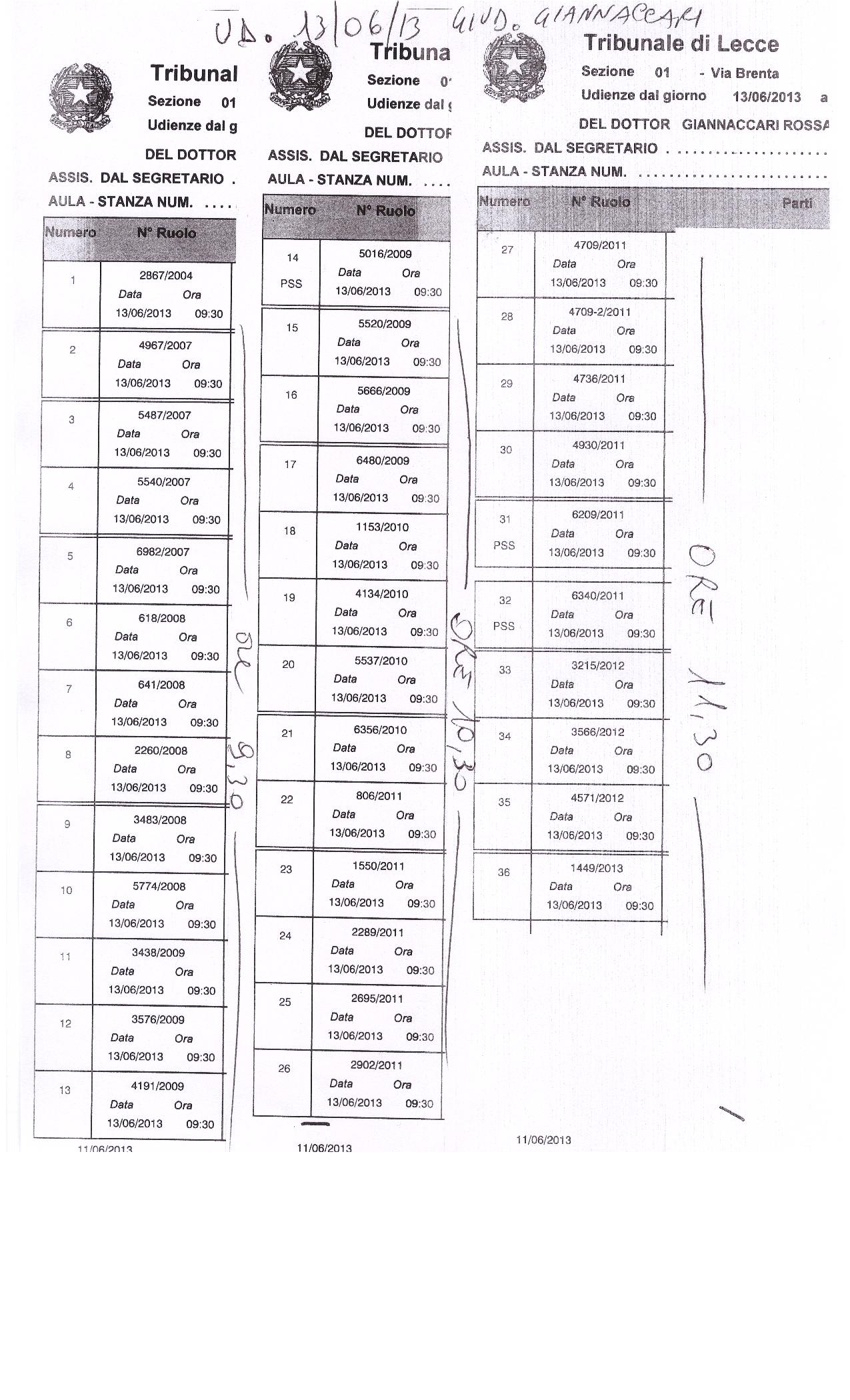 TRIBUNALE DI LECCE RUOLO DR.SSA GIANNACCARI 13 GIUGNO 2013