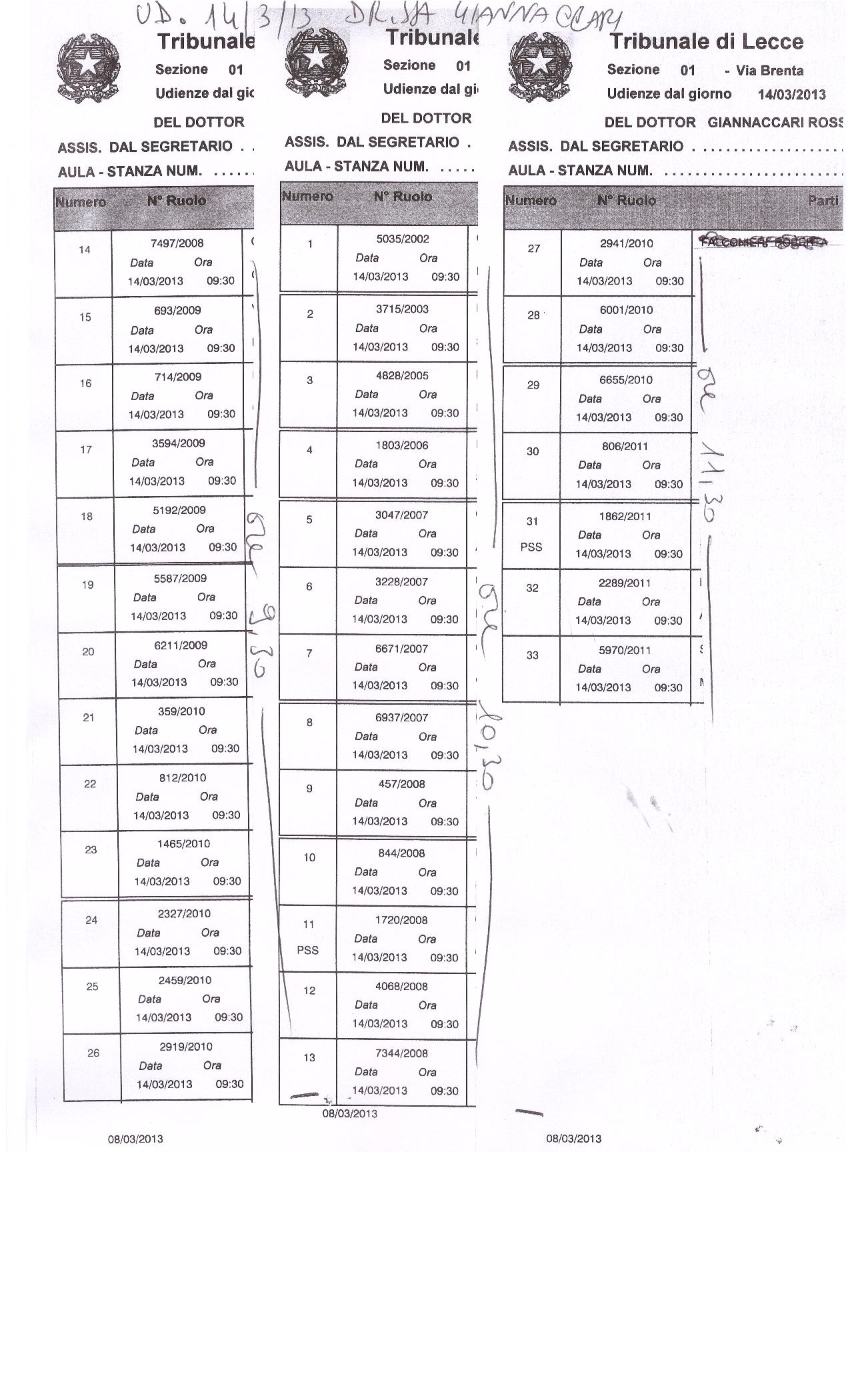 TRIBUNALE DI LECCE ruolo udienza del 14/03/2013 dr.ssa Giannaccari