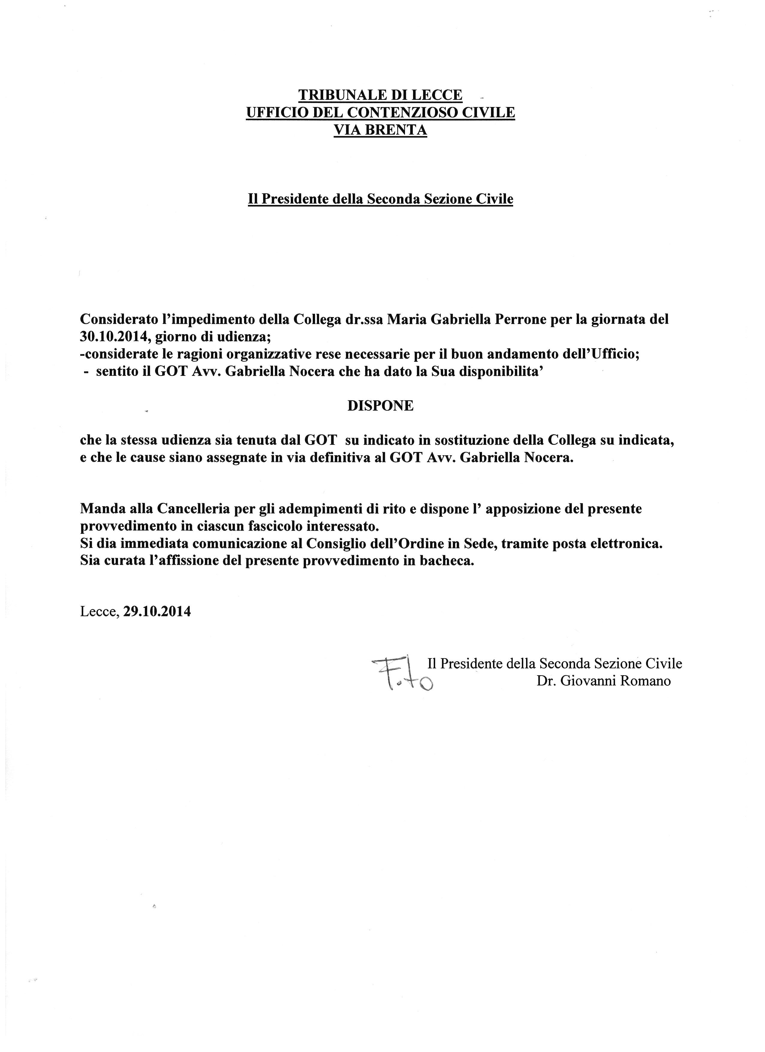 TRIBUNALE DI LECCE - UFF. DEL CONTENZIOSO CIVILE 2a SEZIONE - Sostituzione Dott.ssa M.G. PERRONE per udienza del 30 ottobre 2014.